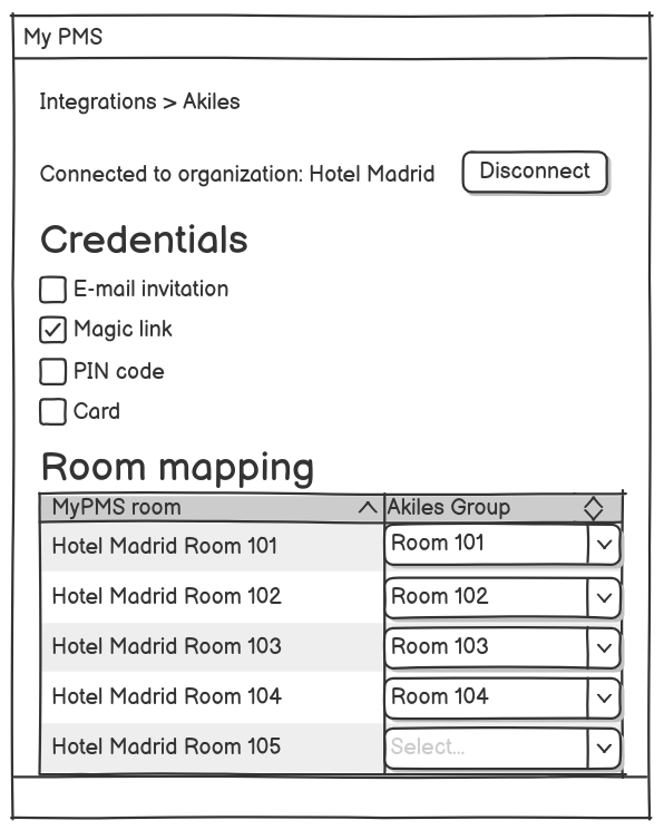 - A section where the user can configure a mapping from each room/property/listing/unit in your software to an Akiles group.